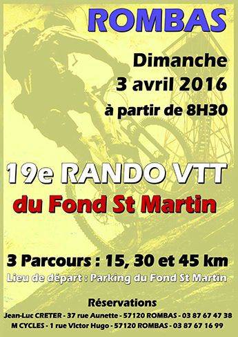 Le Vélo Club de Rombas organise le dimanche 3 avril 2016 à partir de 8h30 la 19e Rando VTT du Fond Saint Martin