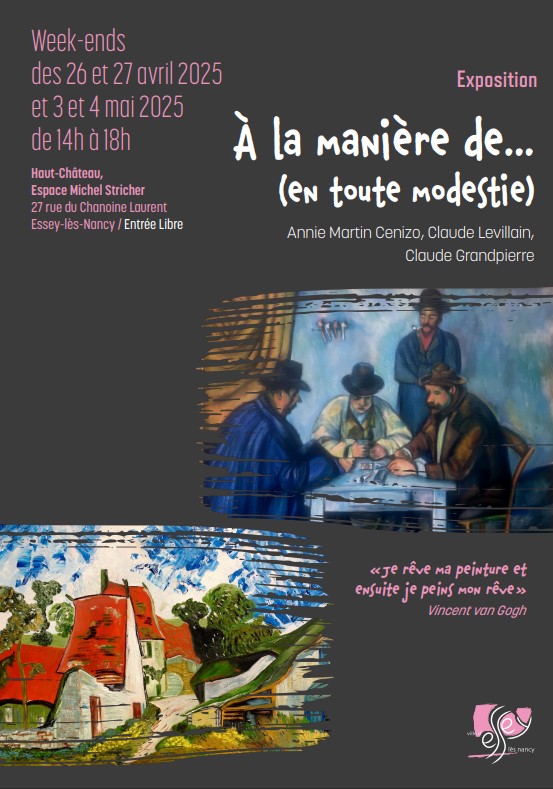Nous sommes trois peintres autodidactes de Laxou, Nancy et Jarville, Mme Annie Martin Cenizo – Mrs Claude Levillain et Claude Grandpierre. Nous avons fait nos ‘’premières armes ‘’ au Cercle des arts de Laxou. La peinture est une passion. La copie de toiles de nos ‘’ Grands Anciens ‘’ nous permet chaque jour de nous remettre en question, de nous interroger et surtout de rester très modestes devant le chemin qui reste à parcourir, mais peu importe comme le suggérait Vincent Van Gogh « Nous rêvons tous à notre peinture et ensuite nous peignons notre rêve …en toute modestie. »