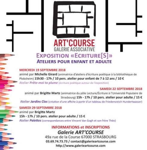 A l’occasion de l’exposition « Écriture[S] », la Galerie Art’Course est heureuse de vous proposer plusieurs ateliers de créations plastiques qui vous feront découvrir toute la richesse et les possibilités de la lettre et de l’écriture !