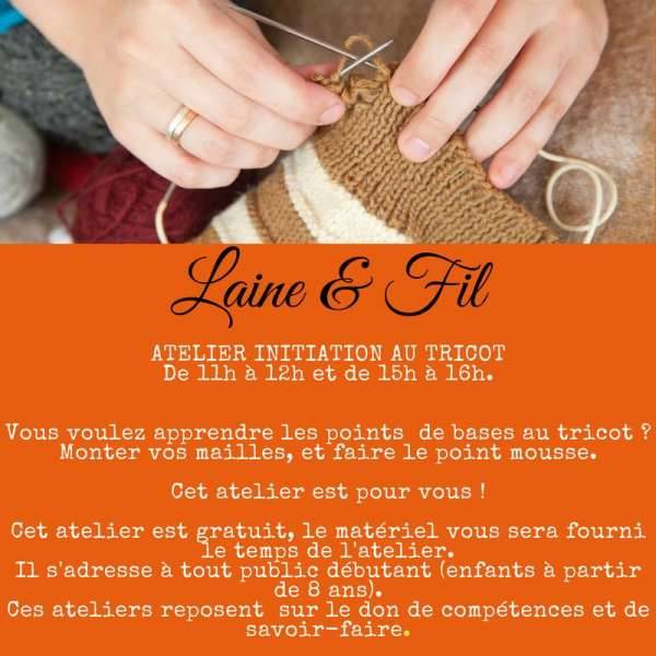 Atelier initiation au tricot de 11h à 12h et de 15h à 16h.