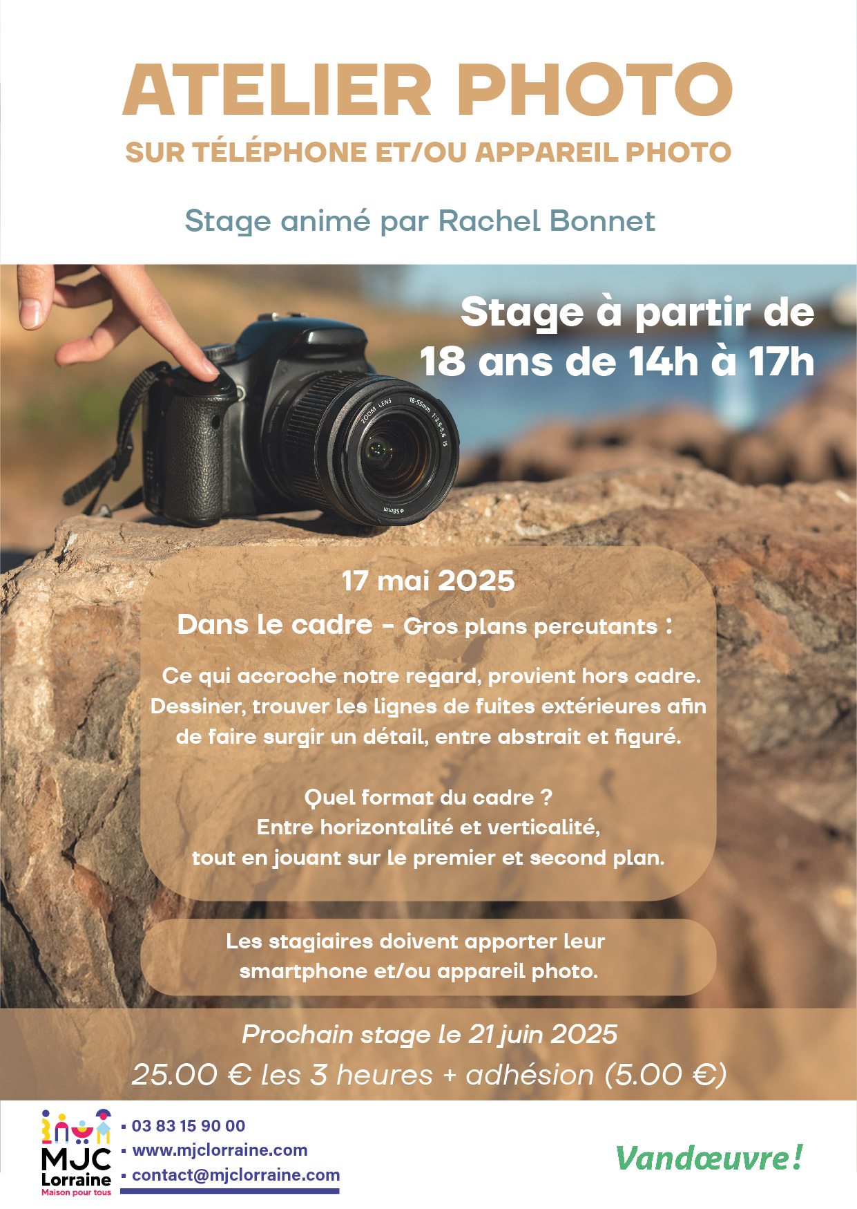 Rachel Bonnet vous propose une série d’ateliers pour explorer différentes approches de la photographie et affiner votre regard. À travers des exercices pratiques et des conseils techniques, chaque séance abordera un thème spécifique pour vous aider à capturer des images percutantes et expressives.