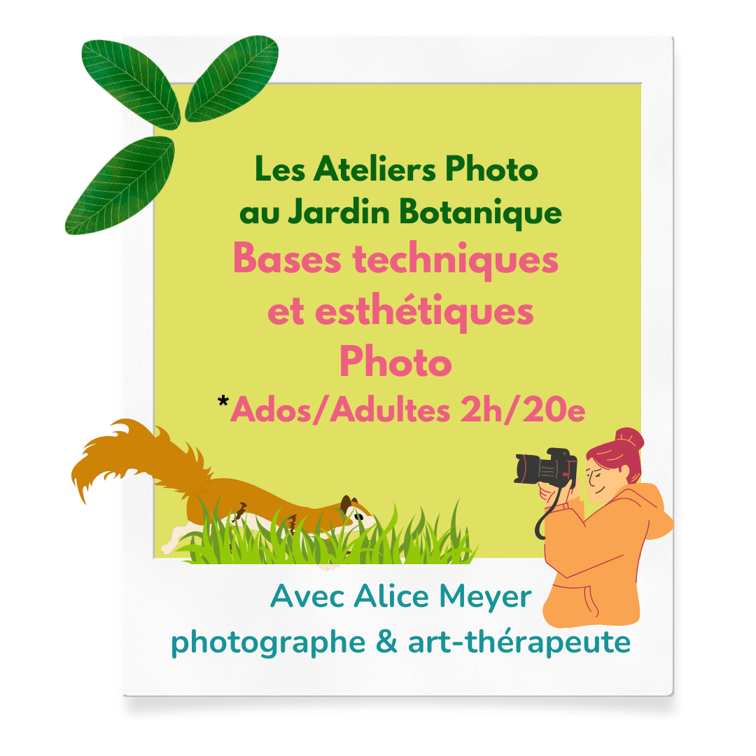 Conditions : Ados/Adultes à partir de 15 ans - 2h – venez avec votre appareil photo - chaises et tables sur place - 6 participants minimum pour maintenir l'atelier - 15 participants maximum - espaces extérieurs hors serres - 20 euros par personne réglable au préalable auprès d’Alice Meyer - en cas de pluie/intempéries, l'atelier sera annulé et remboursé.