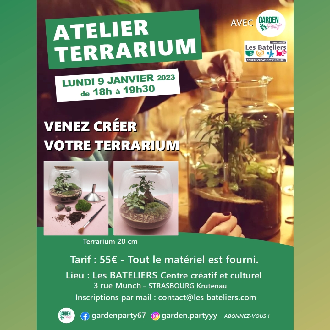 Venez créer votre terrarium tropical avec GARDEN PARTY lors d'un atelier convivial au Centre créatif Les Bateliers à Strasbourg.