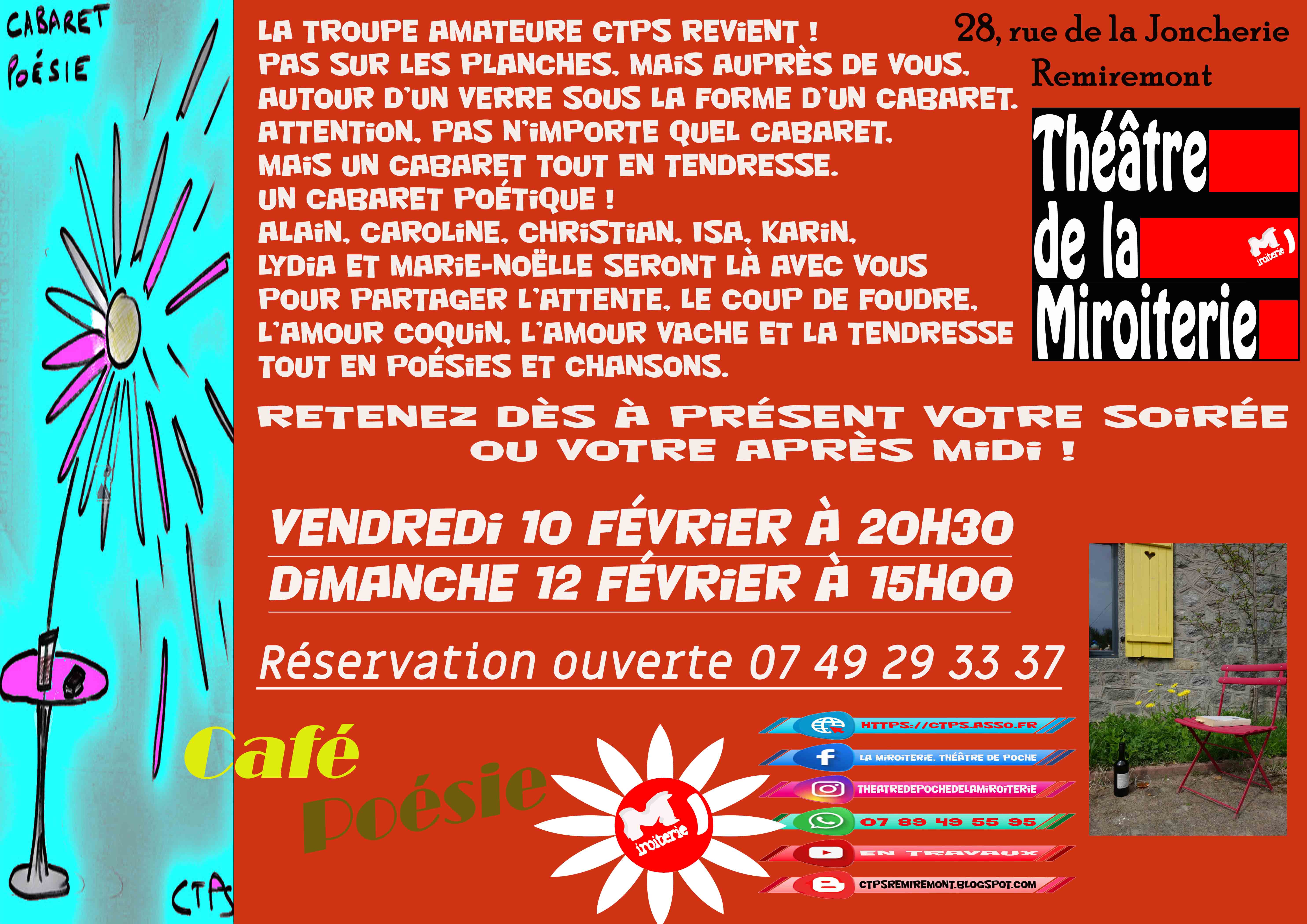 Pas sur les planches, mais auprès de vous, autour d'un verre sous la forme d'un cabaret. Le prochain spectacle de la saison vous est présenté par la compagnie CTPS du Théâtre de la Miroiterie. On vous propose un café poésie sur le thème de l’Amour ! Du coup de foudre à l’amertume, de l’Eros à la tendresse sans oublier l’amour vache, nous vous proposons un vaste tour d’horizon autour de ce thème passionnant. Attention pour ce spectacle original, nous vous proposons deux dates! Rendez-vous le vendredi 10 février à 20h30 ou le dimanche 12 février à 15h00. N’hésitez pas à réserver dès maintenant au 07 49 29 33 37