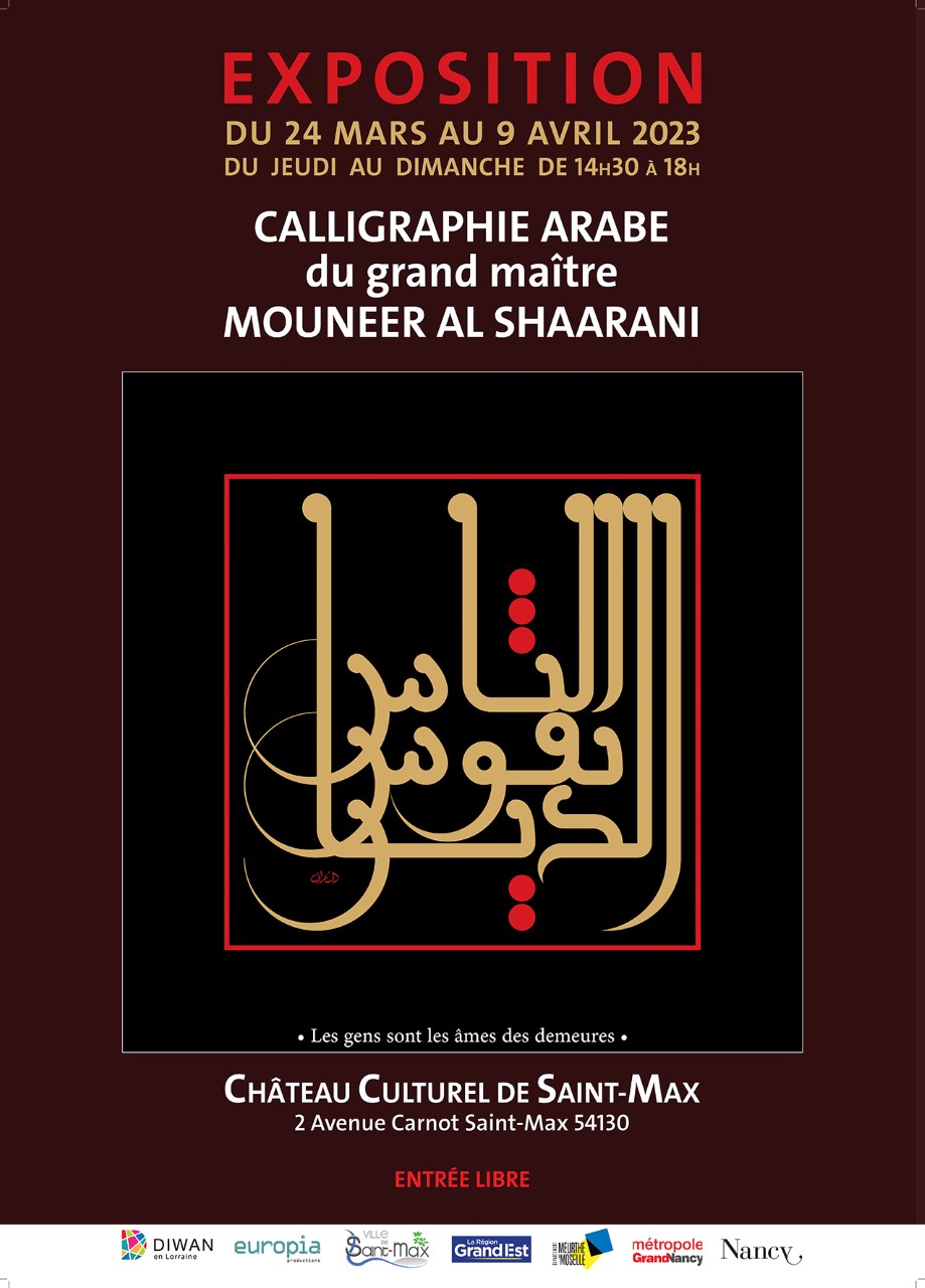 Pour la première fois en Grand Est, un ensemble d’œuvres calligraphiques du Maître syrien Mouneer Al Shaarani sera présentée dans le hall et les Salons Garnier du Centre Culturel Le Château à Saint-Max. Elle vous permettra de découvrir son cheminement dans son art.