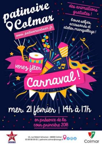 Vous souhaitez vous entraîner pour la cavalcade de Colmar - La patinoire de Colmar fêtera carnaval en présence de la cour princière 2018 ! Une animatrice proposera un atelier maquillage et toutes les personnes se présentant déguisées à l’entrée recevront une entrée + location des patins gratuites valables un autre jour !