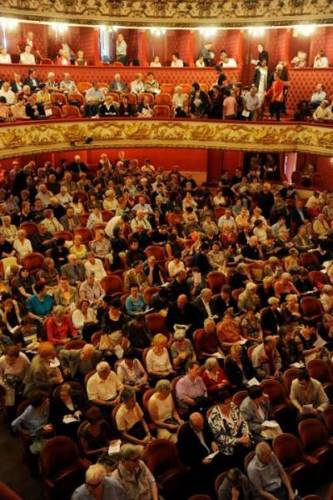 Salle de 1014 places aux tons rouges/or/blancs avec stucs, balcon et galeries pour des opéras classiques.