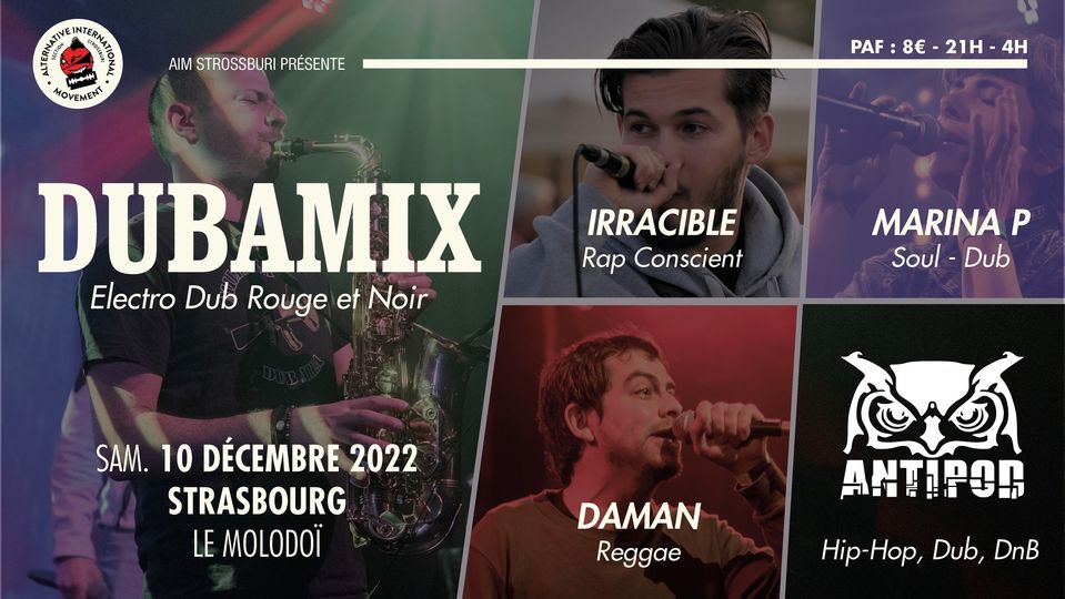 Pour cette fin d'année l'AIM Strossburi pose, le 10 décembre 2022 au Molodoï, une grosse soirée Dub, dont une partie des bénéfices iront à des causes qui méritent notre soutien. Antipod encadrera le début et la fin de soirée et Dubamix convie ses camarades Daman, Irracible et Marina P dans un live où saxophone, samples, esprit de révolte et bass culture dialoguent sur des ambiances électro-dub, reggae, hip-hop, drum'n'bass…