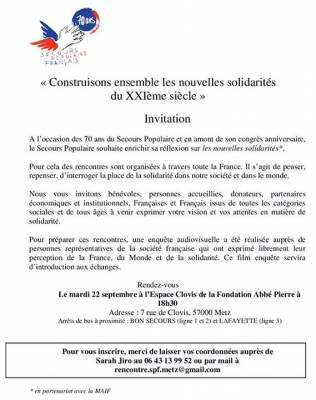 Pour cela des rencontres sont organisées à travers toute la France. Il s’agit de penser, repenser, d’interroger la place de la solidarité dans notre société et dans le monde.