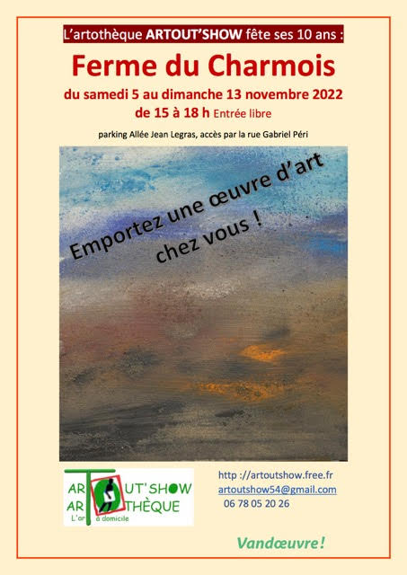 L'artothèque Artout'Show fête ses 10 ans. Emportez une oeuvre d'art chez vous pour 1 mois (15€) ou 3 mois (30€), une centaine d'oeuvres originales exposées par 25 artistes.