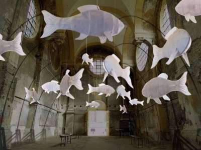 L’installation intitulée ’ICHTUS’ (poisson - symbole chrétien de l’antiquité) est composée d’une myriade de poissons lumineux et mouvants suspendus dans les airs, sur fond de chants liturgiques