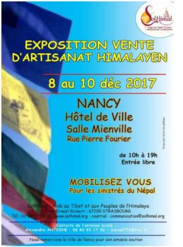 Au profit des sinistrés du Népal. Du vendredi 8 au dimanche 10 décembre de 9h à 18h salle Mienville de l’Hôtel de ville de Nancy.