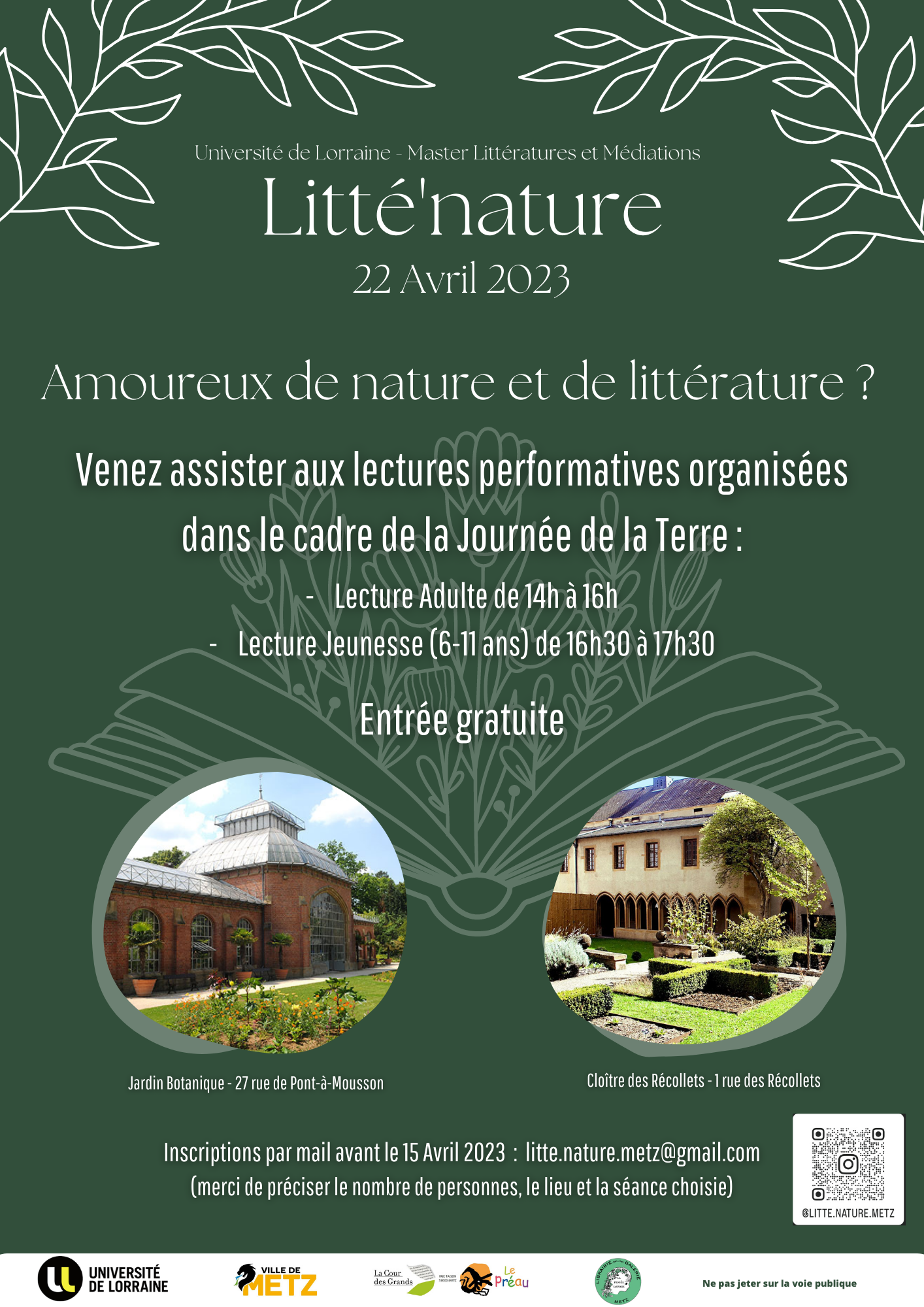 Inscriptions par mail à l’adresse suivante avant le 15 Avril 2023 (merci de préciser le nombre de personnes, le lieu et la séance choisie) : litte.nature.metz@gmail.com