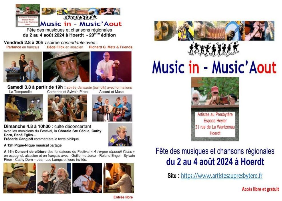 Le Festival Music in – Music’Aout 2024 aura lieu du 2 au 4 août prochain. Fête des musiques et chansons régionales, il a, depuis sa création en 2005, pour seule ambition d’offrir gratuitement en partage : un espace de convivialité, un moment de spiritualité, de faire la fête, de chanter, danser, jouer ensemble sur des musiques de toutes régions. Le trio de fondateurs : Sylvain Piron – Guillermo Jérez et Roland Engel, vous invitent à cette 20ème édition.