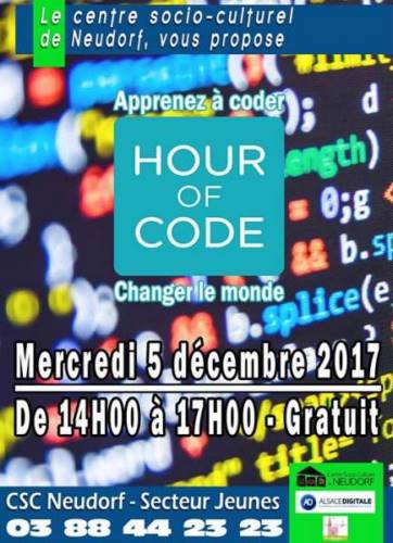 Hour of code est un mouvement mondial qui touche plusieurs dizaines de millions de jeunes dans plus de 180 pays. Le centre soutient cette initiative en vous proposant divers ateliers d’initiation gratuits aux base de la programmation informatique, en partenariat avec Alsace Digitale et la Médiathèque de Neudorf.
