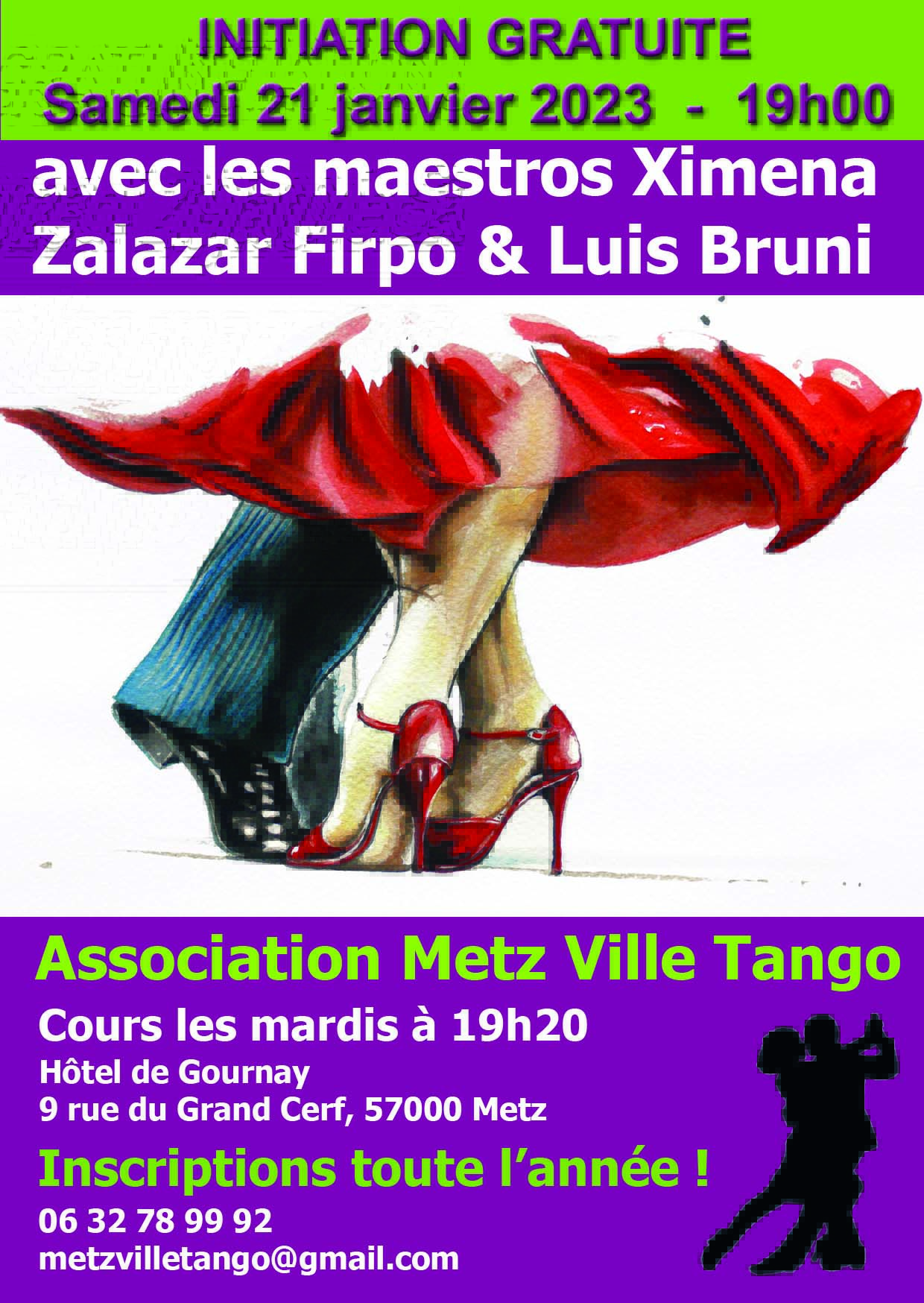 Ce samedi 21 janvier à 19 heures faites vos premiers pas avec des maestros ayant débuté leurs carrières de danseurs à Buenos Aires, de réputation internationale et excellents pédagogues : Xiména Zalazar Firpo qui enseigne et anime Estro Tango à Mulhouse et Luis BRUNI qui enseigne à Paris, au Havre et à Metz.