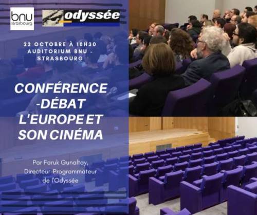 Une conférence-débat sera animée par Faruk Gunaltay, Directeur-Programmateur de l’Odyssée, dans l’auditorium de la BNU pour discuter autour du sujet "L’Europe et son cinéma". La conférence débutera à 18h30 le 22 octobre 2018.