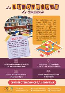 La Ludothèque, ce sont plus de 400 jeux mis à disposition dans un lieu convivial, à découvrir sur place ou à emprunter. Seul, en famille ou entre amis, vous pourrez vous initier ou vous perfectionner à des jeux de société pour tous les âges : enfants, adolescents et adultes ; et à tous niveaux : débutants ou confirmés. C’est un espace favorisant l’échange et les rencontres autour du jeu, animé par nos ludothécaires en vous offrant leurs conseils, et vous proposant de jouer avec vous. L’offre est diversifiée : jeux de cartes, jeux de stratégie, jeux de plateau, grands classiques, jeux de réflexion, etc. Pour connaître la liste de nos jeux, n’hésitez pas à consulter le catalogue en ligne sur centrerotterdam.org. La ludothèque est ouverte les lundis et vendredis de 16h à 19h, les mercredis de 14h à 19h, avec une soirée jeux inédite le dernier vendredi du mois qui se prolonge jusqu’à 20h.