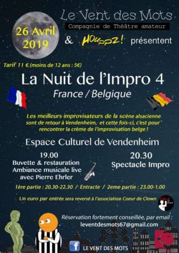 La compagnie de théâtre d’improvisation « Le Vent Des Mots » et « Houppz Théâtre » récidivent avec la quatrième édition de la Nuit de l’Impro le 26 avril 2019 !!!
