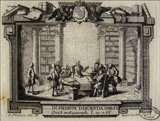 Légende : Valentin Jamerey-Duval donnant un cours dans la bibliothèque du château de Lunéville, illustration de Salomon Kleiner pour les Mémoires de Jamerey-Duval, vers 1750