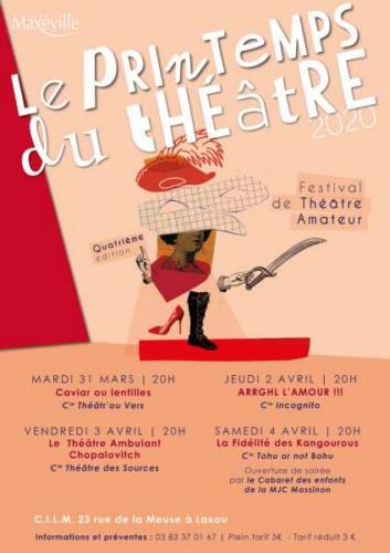 Samedi 4 avril - 20h: La Fidélité des kangourous. Cie Tohu or not Bohu. Huis clos cocasse (de Maryline Bal; mise en scène de Philippe Huriet; ouverture de soirée assurée par les enfants de l’atelier théâtre de la MJC Massinon)
