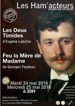 Les Ham’acteurs vous invitent à leur représentation du 24 mai, à 20h, pour une soirée « Feydeau-Labiche ». Nous aurons le plaisir de jouer devant vous « Les Deux Timides » d’Eugène Labiche et « Feu la Mère de Madame » de Georges Feydeau.
