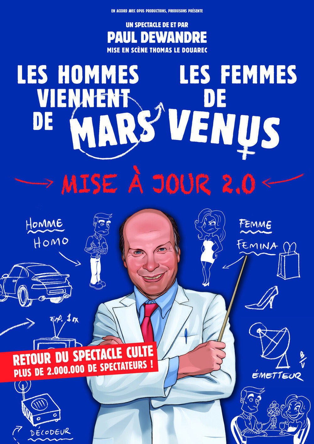 Euterpe et Produisons présentent en accord avec Opus Productions : LES HOMMES VIENNENT DE MARS ET LES FEMMES DE VENUS À l’heure où les rapports hommes-femmes sont questionnés, décortiqués, voire malmenés, venez passer une soirée exceptionnelle avec un spectacle déjà joué devant plus de deux millions de spectateurs ! Il s'agit d'un hymne à une meilleure compréhension mutuelle. Loin de défendre de vieux clichés, il s’inscrit totalement dans la lutte pour l’égalité entre femmes et hommes. Son incroyable succès nous prouve que quelles que soient nos singularités culturelles, biologiques ou sexuelles, nous courons tous après la même chose : l’amour ! Vous échangerez des regards… Vous vous donnerez des coups de coudes… Et puis vous sourirez -parfois, vous éclaterez de rire -souvent, et vous vous surprendrez même peut-être à réfléchir… Vous naviguerez dans les méandres des logiques masculines et féminines et vous vous exclamerez: Ah si j’avais compris tout cela plus tôt...