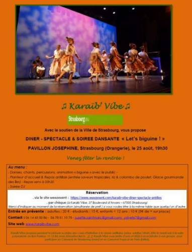 Pour profiter des tarifs, réservations en ligne (https://www.weezevent.com/karaib-vibe-diner-spectacle-antilles) ou par chèque à l’attention de Karaïb’Vibe, 37 bld d’Anvers, 67000 STRASBOURG (achat sur place: 5 € de plus).