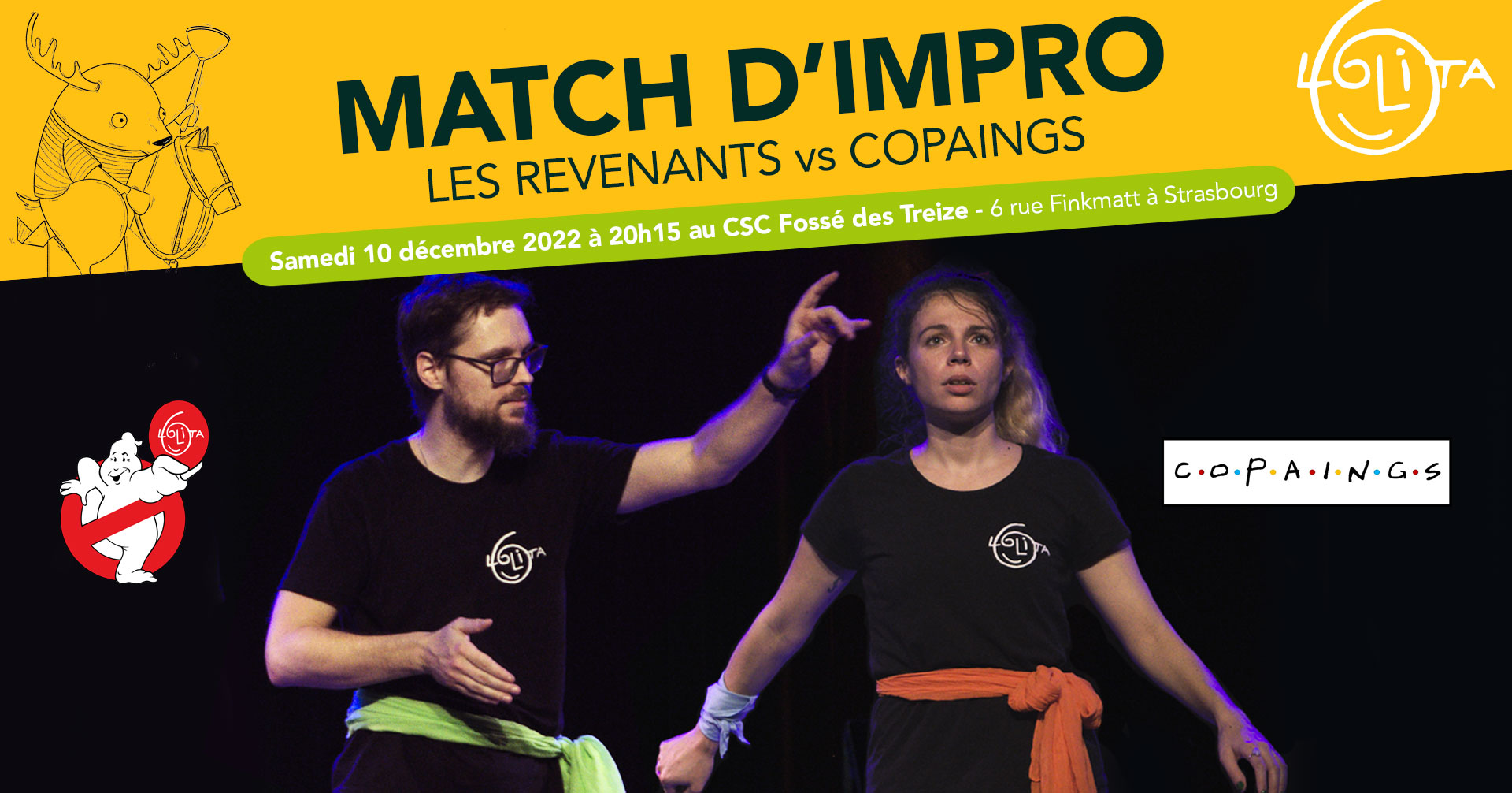 C’est le dernier match d’impro de l’année 2022 du Championnat d'impro Lolita… oooh! Mais aussi le premier pour deux des nouvelles équipes de cette saison! Ouééé! Vous retrouverez pour la première fois sur scène Les Revenants et COPAINGS! La première équipe hante la Lolita depuis de nombreuses années, cachée sous un drap en fond de scène ou dans les soirées d’after de spectacles… Les Revenants ne sont jamais vraiment partis puisqu’ils sont revenus et leur jeu spectral risque de vous faire frissonner. L’équipe d’en face est composée de vrais POTOS! De vrais ZAMIS de toujours, complices comme par deux… bref, des COPAINGS! Pour eux l’amitié passe avant tout et ils n’hésitent pas à tout laisser tomber en cas de rassemblement de l’équipe car c’est ça les vrais COPAINGS! Alors venez retrouver Casper et ses copaings sur la scène du Fossé des Treize le samedi 10 décembre!