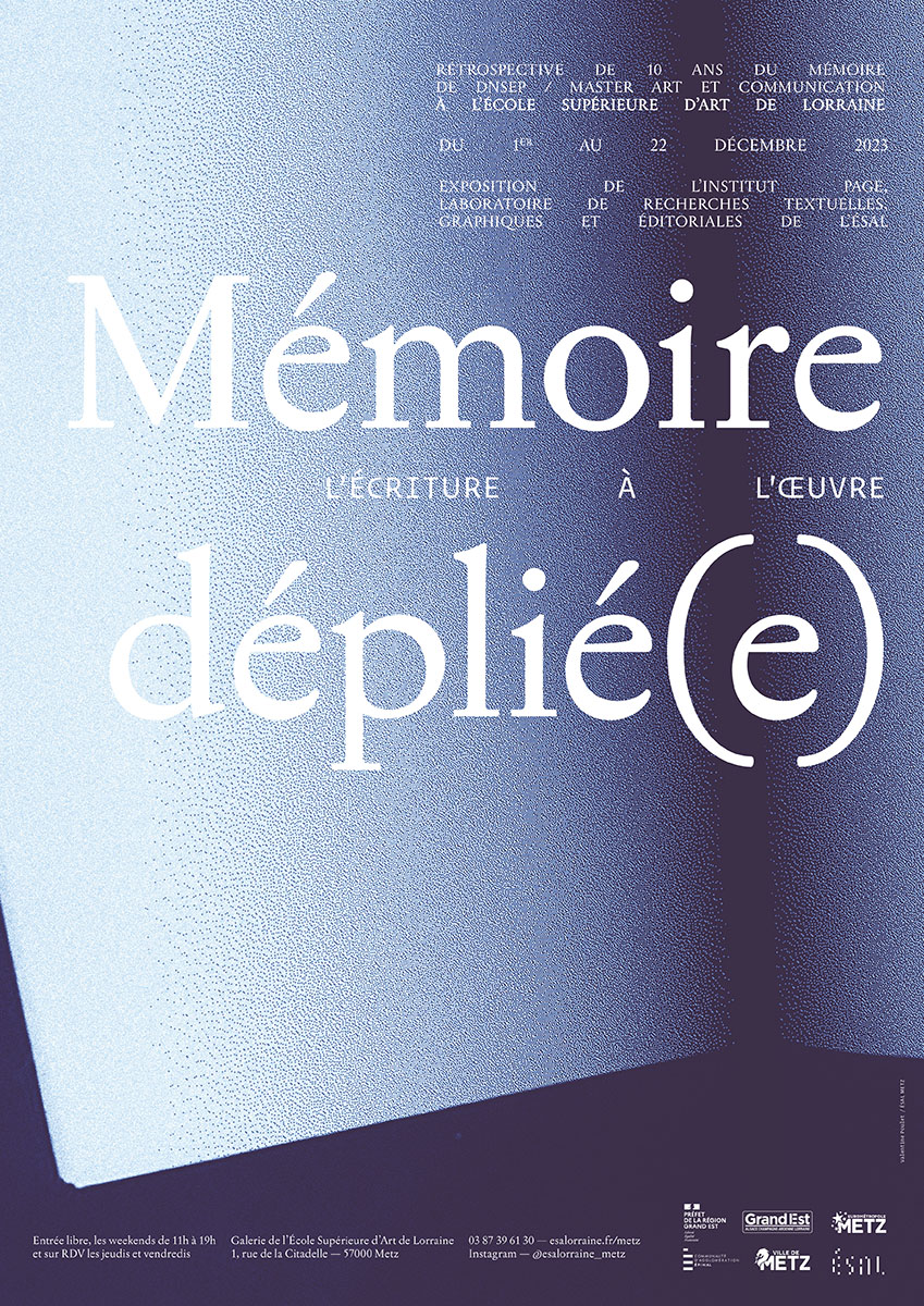 L’ensemble de l’exposition, dont la scénographie, la signalétique, la communication visuelle — a été réalisée par le « comité mémoire » de l’Institut Page, laboratoire de recherches textuelles, graphiques et éditoriales de l’ÉSAL.