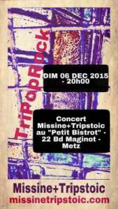 La formation musicale messine "Missine + Tripstoic et 2 GFTO" donnera certainement son dernier concert de l’année au PETIT BISTROT situé au 22 Boulevard Maginot à Metz (près de la place Mazelle et à 2 pas de la Porte des Allemands) en ce dimanche 06 décembre de la Saint-Nicolas.