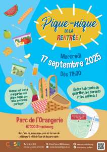 Rendez-vous le mercredi 17 septembre 2025 à partir de 11h30, sur l’aire de pique-nique du Parc de l’Orangerie (près de l’espace canin et du terrain de pétanque).