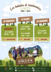 Des promenades très faciles, accessibles à tous les Seniors, ont lieu les lundis après-midi. Les lundis et mardis après-midi, ce sont des balades faciles pour garder la forme. Les jeudis, ce sont des randonnées de niveau moyen nécessitant une petite condition physique, où les randonneurs partent à la journée, et se restaurent soit avec un casse-croûte tiré du sac, soit avec un repas à l’Auberge. L’hiver, c’est en raquettes à neige que nous évoluerons avec du matériel prêté par nos soins. Le transport est assuré par nos moyens depuis le siège de l’association en minibus à destination des Vosges.