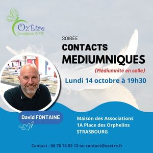 David Fontaine, médium reconnu pour son don et son approche bienveillante, saura créer lors de cette soirée un espace sécurisé et respectueux où chacun pourra vivre cette expérience unique. Sa venue à Strasbourg en octobre sera une nouvelle opportunité exceptionnelle de participer à une soirée de médiumnité en salle et de découvrir, ou redécouvrir, le pouvoir des contacts médiumniques.