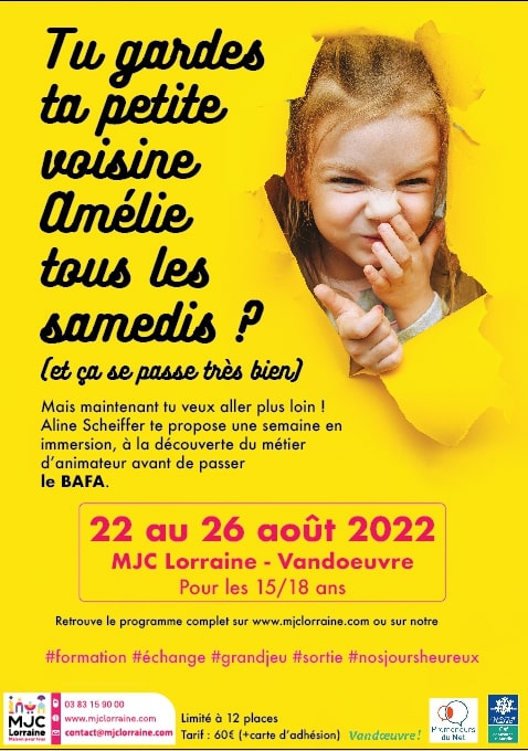 Le but à travers cette semaine sera de te faire découvrir ce métier mais aussi de t’aider à préparer ton BAFA. Peu de places sont disponibles alors n'hésite pas à t’ inscrire au secrétariat de la MJC Lorraine.
