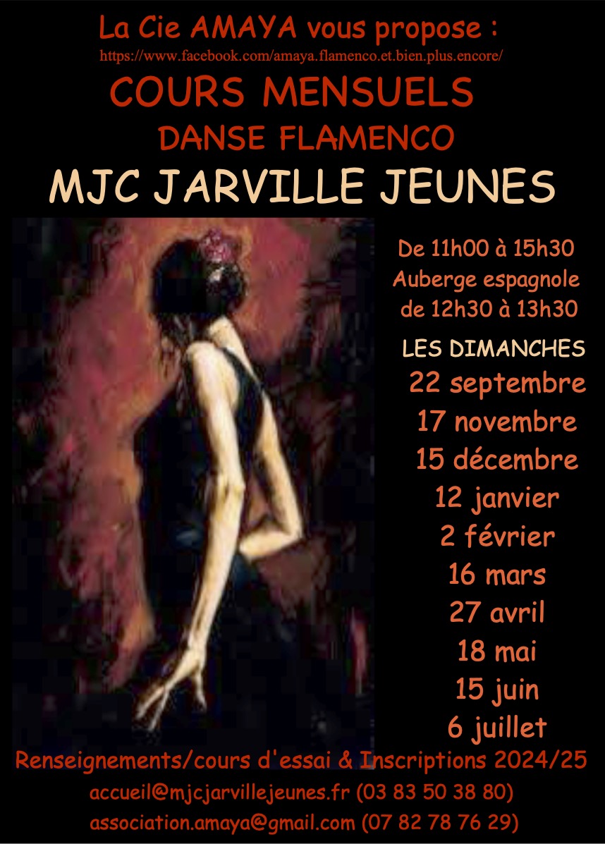 De septembre à juin, la Cie AMAYA propose à la MJC Jarville Jeunes au studio de danse L'Atelier à Jarville-la-Malgrange des cours de danse flamenco sous forme de stages mensuels un dimanche par mois de 11h à 12h30 le matin et de 13h45 à 15h15 l'après-midi avec auberge espagnole le midi pour celles et ceux qui le souhaitent.