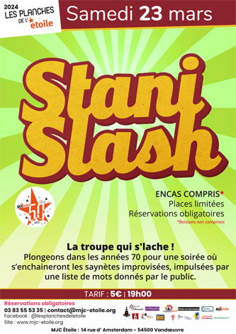 La troupe qui s'lache ! Plongeons dans les années 70 pour une soirée où s’enchaineront les saynètes improvisées, impulsées par une liste de mots donnés par le public.