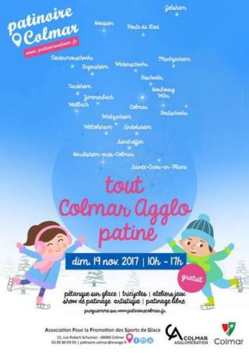 La patinoire de Colmar a le plaisir de vous inviter à la seconde édition de Tout Colmar Agglo patine. Au programme de nombreuses animations gratuites (pour les habitants de Colmar et Colmar Agglo) pour petits et grands. La matinée, pendant que les tout-petits pourront patiner dans le jardin des glaces, les plus grands pourront faire une course d’Ice Bike (tricycle sur glace) et découvrir l’Eisstöck (pétanque sur glace). L’après-midi, des jeux ludiques seront proposés par le Club de Hockey de Colmar pour les enfants suivit d’un show de patinage artistique et d’un temps de patinage libre.
