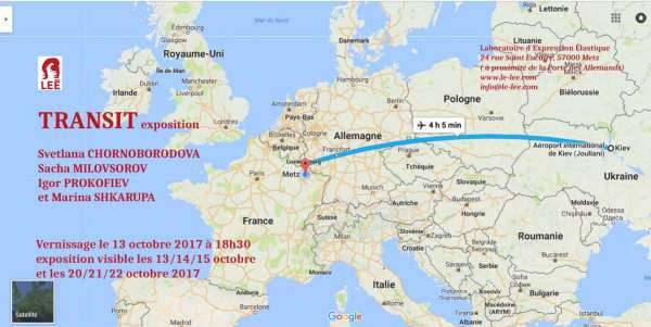 Suite à l’exposition Cocorico ! à la galerie 36 (Kiev, Ukraine ) qui présentait les œuvres de Leonor Comin, Roxane Lippolis et Baptiste Verdoliva, cette exposition au LEE - Laboratoire d’Expression Élastique se veut un pont entre deux lieux d’art et surtout entre deux cultures. L’exposition TRANSIT au LEE (Metz, France) regroupe des œuvres de Svetlana Chornoborodova, Sacha Milovsorov , Igor Prokofiev et Marina Shkarupa.