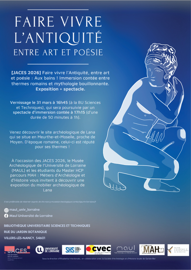 À l’occasion des JACES 2026, le Musée Archéologique de l’Université de Lorraine (MAUL) et les étudiants du Master HCP parcours MAH : Métiers d’Archéologie et d’Histoire vous invitent à découvrir une exposition du mobilier archéologique de Lana, dont le vernissage sera suivi d'un spectacle d’immersion contée à 17h15 (d’une durée de 50 minutes à 1h).