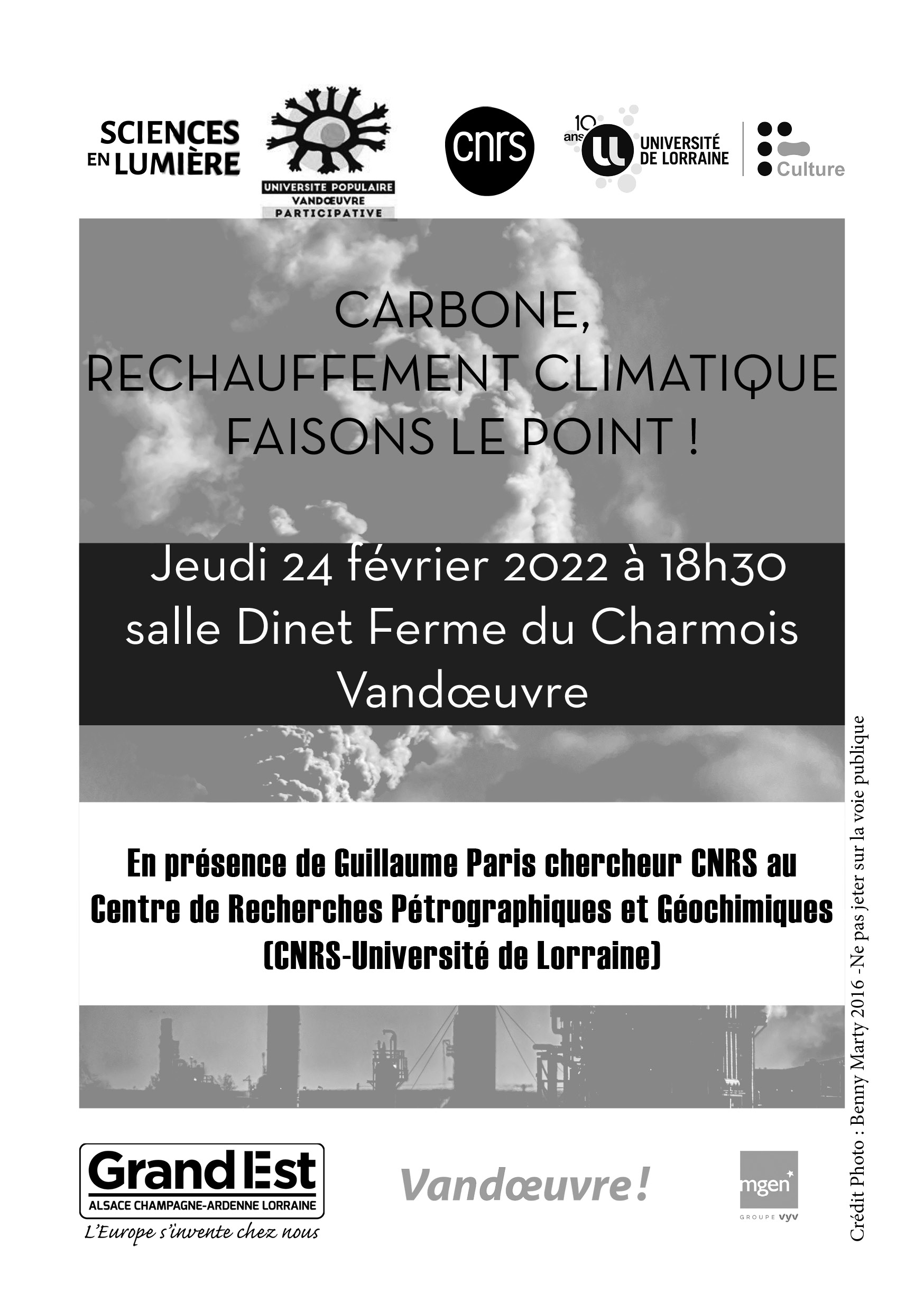 La première soirée propose de mieux comprendre le cycle du carbone, ses réservoirs et ses puits, et les mécanismes de contrôle de la concentration en dioxyde de carbone dans l’atmosphère. Ce gaz est le principal responsable de l’augmentation de l’effet de serre et du réchauffement climatique. Guillaume Paris, chargé de recherche CNRS au CRPG (Centre de Recherches Petrographiques et Géochimiques) nous permettra de mieux appréhender ces enjeux et nous explorerons quelques pistes, collectives et individuelles, pour comprendre et réduire notre empreinte carbone.