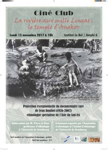 L’Association d’ethnologie de l’Université de Strasbourg a le plaisir de vous inviter au premier ciné-club de l’année avec la projection du film documentaire « La Rivière aux Mille Lingas (Oo Kbal Spean) ». Il retrace la (re)découverte de ce site archéologique au Cambodge par l’ethnologue Jean Boulbet (1926-2007) en 1968.
