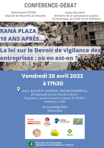 En présence du Député de Meurthe et Moselle Dominique POTIER rapporteur de la loi sur le devoir de vigilance des sociétés mères et donneuses d'ordres et de Odile DELHAYE, membre de la commission nationales Justice Economique de CCFD Terre solidaire.