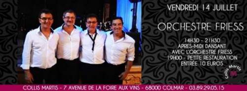 Vendredi 14 juillet après midi, on danse au Collis Martis avec le meilleur orchestre de la Région, les Friess qui fait son grand retour dans l’établissement. Pause restauration de 19h à 20h. Pensez à réserver.