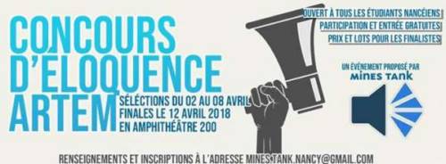 Venez donc assister à cette Grande Finale de la troisième édition du concours d’Éloquence organisé par Mines Tank, le jeudi 12 Avril à 18h30 dans l’amphithéâtre 200 du Campus ARTEM (88 Rue du Sergent Blandan).