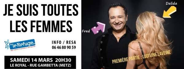 Samedi 14 mars à 20h30 au ROYAL, 2 rue Gambetta à Metz, vous découvrirez FRED FAURE dans la pièce musicale autobiographique JE SUIS TOUTES LES FEMMES. Le comédien et chanteur y rend un hommage poignant à son idole DALIDA . Il y retrace son parcours d’homme avec émotion et parfois humour, et interprète une vingtaine d’extraits des plus grands tubes de sa vedette préférée, ainsi que des inédits pour appuyer et rythmer son témoignage. En première partie vous retrouverez la comédienne LUDIVINE LAVEINE que l’on a apprécié en tant que co-présentatrice de l’émission ÇA CARTOON sur canal+. LUDIVINE nous devoilera un extrait de son spectacle J’AI RENDEZ-VOUS AVEC VOUS! En interlude, NADO, la chanteuse espagnole présentera son premier single plein de soleil, DESPERTAR.