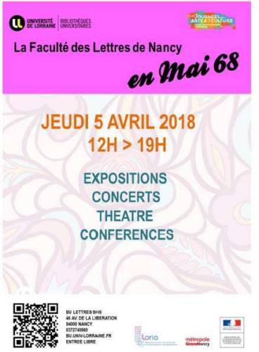 Le fil rouge de cette journée est le 50ème anniversaire de Mai 68. Nous vous invitons à venir découvrir l’exposition La Faculté des Lettres de Nancy en mai 68, une pièce de théâtre La Grève par les acteurs du TUN et des conférences par des enseignants-chercheurs de l’Université de Lorraine.