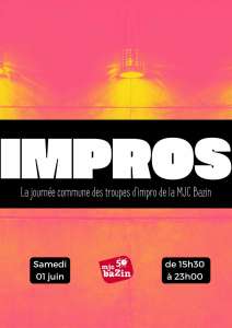 Pour bien terminer la saison, les 7 compagnies d’improvisation de la MJC Bazin vous accueillent le SAMEDI 01 JUIN dès 15h30 pour 5 spectacles joués en commun. Au programme, du rire, du rythme, des jeux, de la romance… enfin bref, de l’impro !