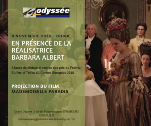 En cette occasion, la réalisatrice Barbara Albert présentera son film Mademoiselle Paradis, ce dernier sera bien évidemment projeté au cours de la soirée. Par ailleurs, vous assisterez à la remise des prix du Festival en présence du jury et de la présidente d’Eurimages.
