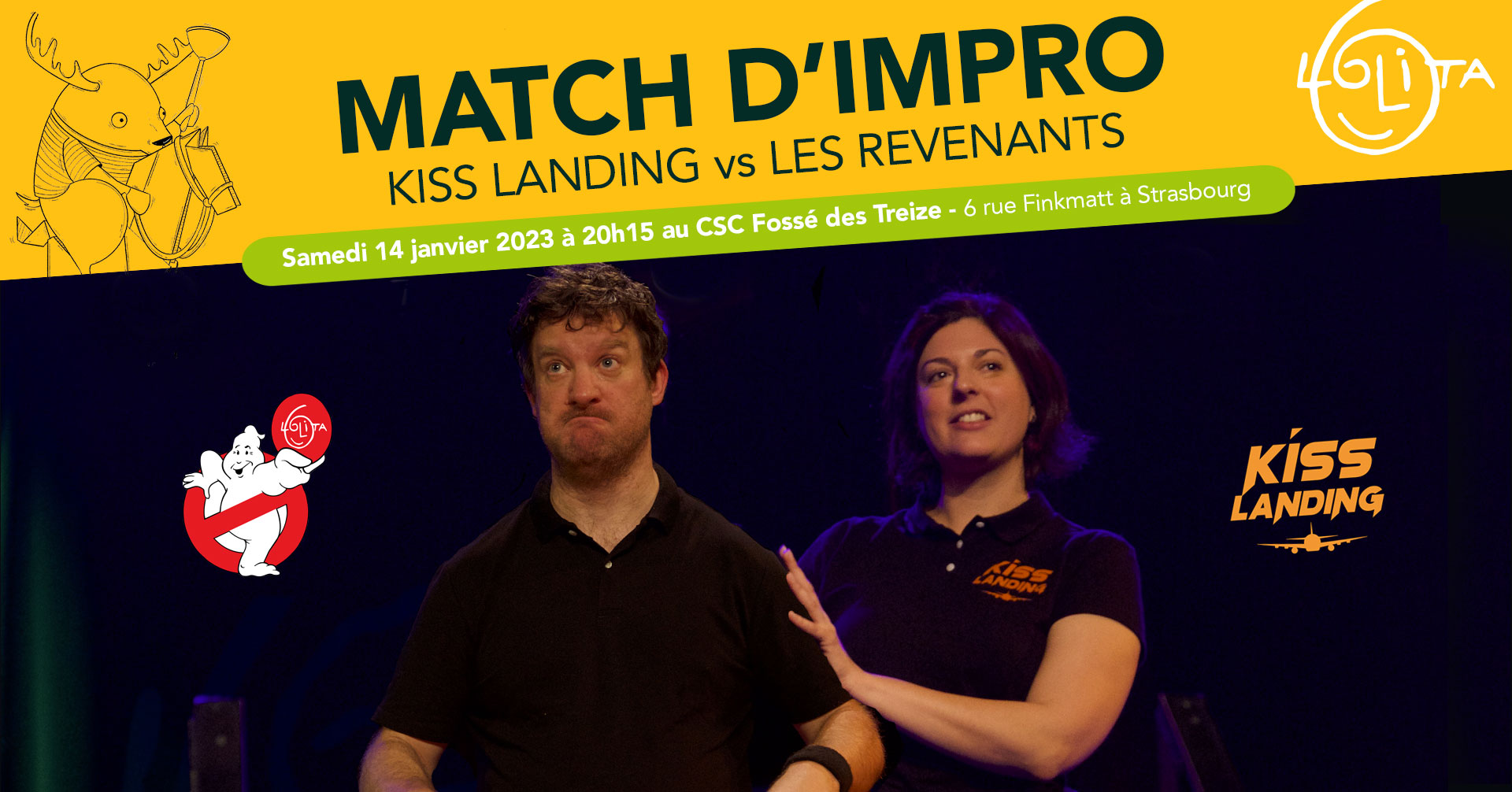 C’est reparti pour un nouveau match de théâtre d’impro du Championnat Lolita! De retour de vacances, l’équipe des Revenants va se faire accueillir par une bande d’aiguilleurs du ciel appelée Kiss Landing. Mais si ces derniers n’ont aucun mal à garer les avions, qu’en est-il des esprits frappeurs ? On doute qu’un drap-housse soit aussi maniable qu’un bagage en soute… La rencontre promet un décollage des plus esctoplasmique! Malgré les apparences, Le spectacle aura bien lieu au Fossé des Treize et pas à l’aéroport d’Entzheim, même si quelques voyageurs égarés risquent de hanter les lieux. On vous attend pour houhouer et kisskisser tous en chœur, le samedi 14 janvier!